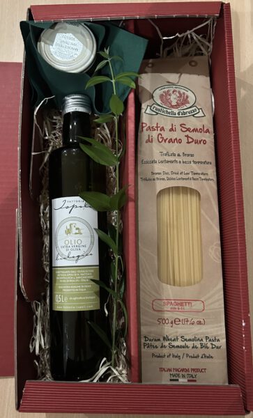 Naturreines, kaltgepresstes toskanisches Olivenöl aus biologischem Anbau von der Fattoria Ispoli, kombiniert mit Spaghetti und schmackhafter Olivencreme.